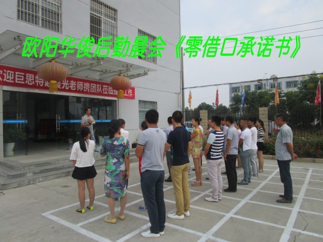 在此,湖北歐陽華俊專用汽車有限公司全體員工在歐董事長的帶領下,每天開始晨會活動,在晨會中,大家充滿激情,充滿動力、爆發力和戰斗力,很后每天的晨會在全體人員的《零借口承諾書》中圓滿結束。為歐陽華俊的美好明天加油,繼續前進著!
