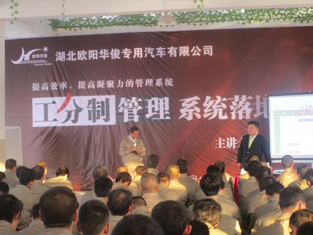今天趙晨光老師攜『工分制管理項目組』再一次走進湖北歐陽華俊專用汽車有限公司,總結前段時間工分整改狀況,校審執行手冊。下午為歐陽華俊做工分全員啟動會,用『工分』的方式實現歐陽華俊從家族企業向現代企業轉變,做百年企業!加油!