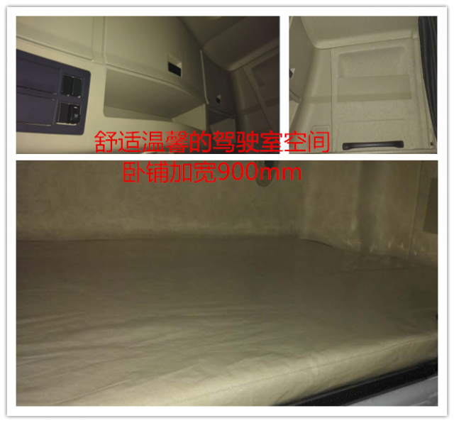 相比陜汽現有牽引車產品,黃金版內飾材料做工更加考究,舒適性提升。對于定位于長途干線高效物流的車型,黃金版在內飾空間也大幅改進,司機休息空間得到明顯改進,臥鋪尺寸達到近900mm,為駕乘人員提供很寬敞的休息空間。上層臥鋪采用鋁制表框,耐用美觀,頂部帶有天窗,空氣流通,采光性能更佳。