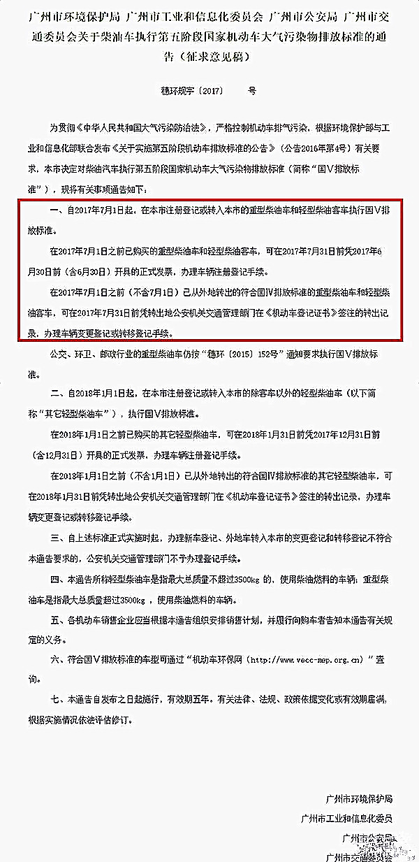 據了解,自2017年7月1日起,在陜西省行政區域內所有生產、進口、銷售、注冊和轉入登記的重型柴油車、重型兩用燃料車、重型單一氣體燃料車,須符合“國五”排放標準要求。外地轉入車輛也需執行“國五”排放標準,2017年1月1日起,西安市對不符合“國五”排放標準的新車和外地轉入車輛,不予注冊和轉入登記。