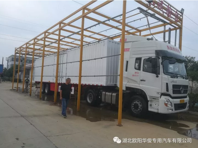 湖北歐陽華俊專用汽車有限公司早在2014年年底公司投資建立了“淋水試驗臺”,目的是檢驗本公司生產的所有廂式運輸車的車身密封性,更進一步提高廂式運輸車的產品質量,踐行“車行天下,質求完美”的理念,歐陽華俊淋水試驗臺成為廂式半掛車檢驗工序中的福音。