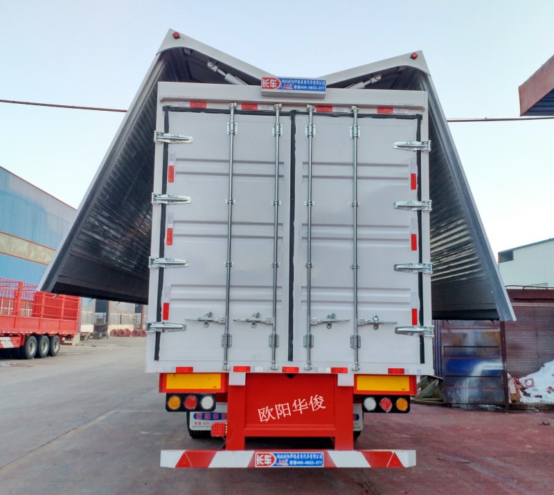 此3臺飛翼半掛車廂的尺寸為:13.58米長×2.55米寬×4米離地高。2軸直梁的車廂,車廂兩側為整體舉升,全飛式中開啟,后門廂式對開門。車廂的液壓系統采用雙作用油缸、電子閥組配原裝進口直流電機驅動,內嵌式防水按鈕開關。此次防水頂布為整頂篷布,達到更好的防水效果。