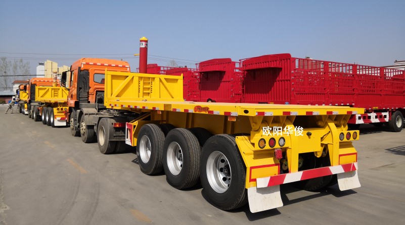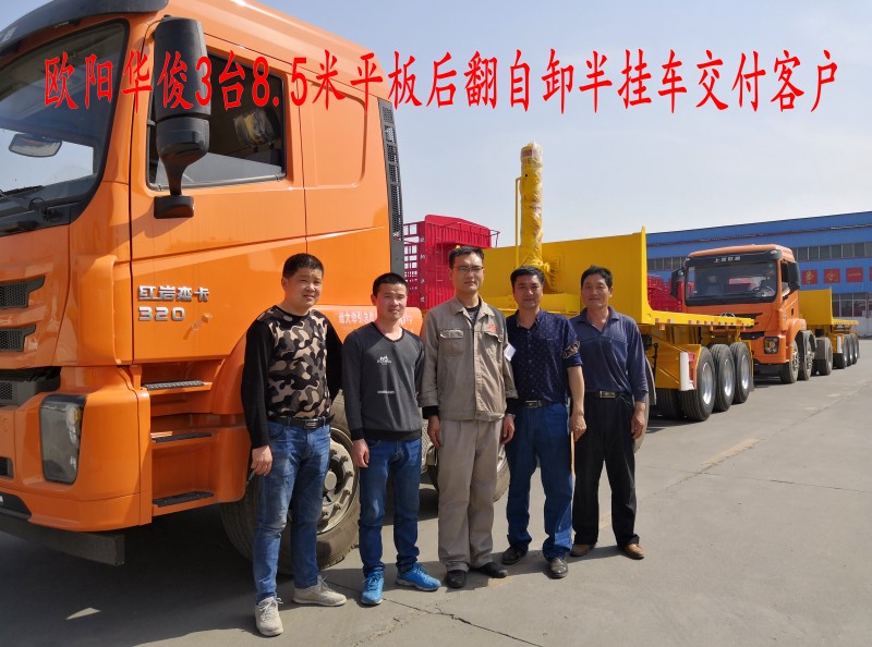 區(qū)域銷售經(jīng)理免費(fèi)為您提供方案歐陽華俊3臺(tái)8.5米輕型平板后翻自卸半掛車交付客戶