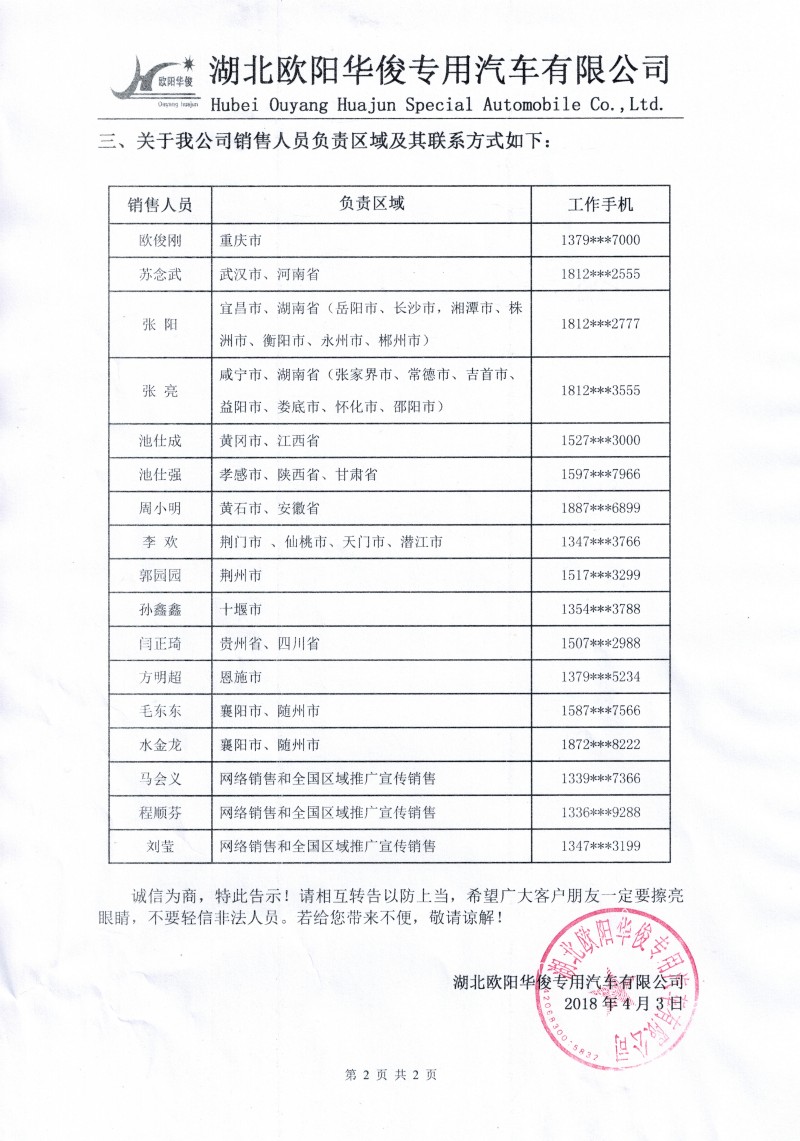 發布日期:2018-04-08 04:39:06 編輯:歐陽華俊 瀏覽量:6858近期,湖北歐陽華俊專用汽車有限公司(以下簡稱湖北歐陽華俊)不斷接到卡友和汽車經銷商朋友反饋,稱有人以“歐陽華俊”的名義從事半掛車銷售的活動,擾亂了歐陽華俊半掛車的市場質量與價格,對湖北歐陽華俊專用汽車有限公司品牌產生了不良影響,亦對我司銷售人員造成很大的困惑與傷害!