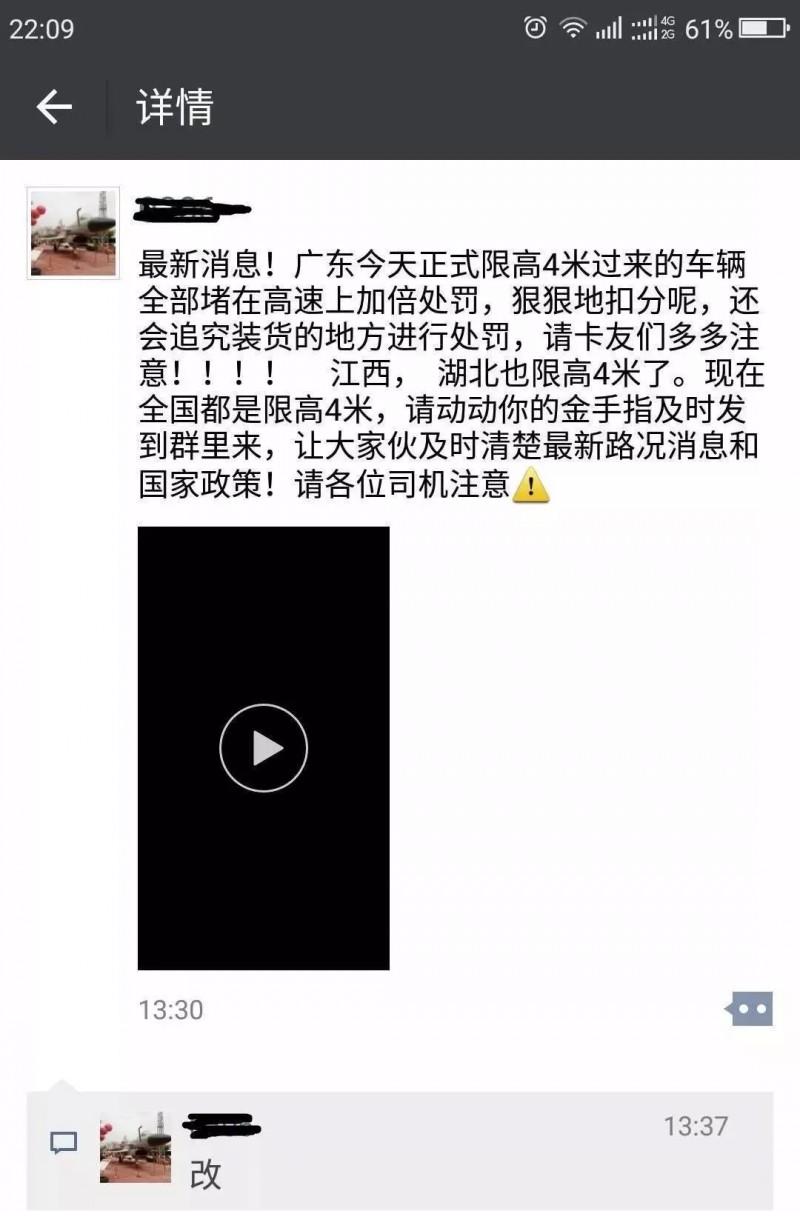 目前,很多微信群及朋友圈都在傳這么一件事:“XX今天正式限高4米過(guò)來(lái)的車輛全部堵在高速上加倍處罰,狠狠地扣分呢,還會(huì)追究裝貨的地方進(jìn)行處罰,請(qǐng)卡友們多多注意?。。?!XX也限高4米了?,F(xiàn)在全國(guó)都是限高4米,請(qǐng)動(dòng)動(dòng)你的金手指及時(shí)發(fā)到群里來(lái),讓大家伙及時(shí)清楚很新路況消息和國(guó)家政策!!”