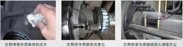 4、在每次保養(yǎng)車軸或更換制動蹄片時及時清除傳感器及齒圈表面灰塵或油污,保持齒圈或傳感器前部的清潔。