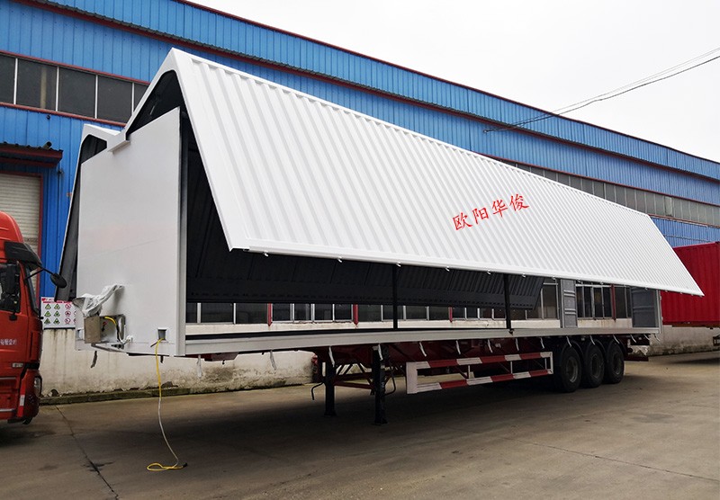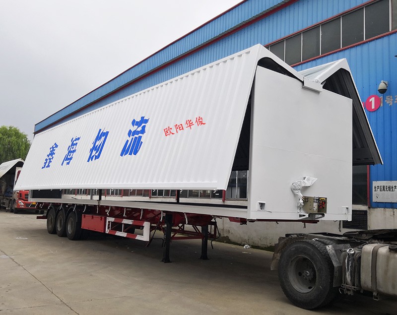 此飛翼上裝為全飛式中開啟采用進口動力單元,鹽城油頂,車廂采用內封鍍鋅板(頂部不封),外掛瓦楞板,頂部加防水篷布,每邊16個臥環(huán),帶防水槽,底板采用3個厚紋理防滑鋼板,外表防滑,美觀耐用,貨物運輸安全可靠。