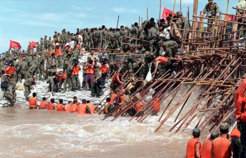 2008年5月13日 成都軍區空軍駐蓉部隊隊員托舉接力,在暴雨中搶運受傷群眾。