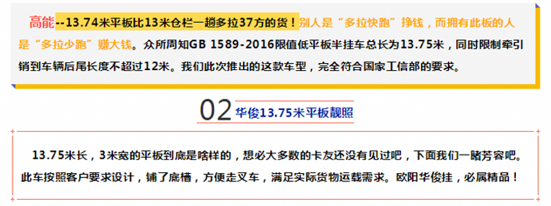 歐陽華俊生產制造的13.75米平板實屬匠心之作,無論是掛車整體外觀還是局部細節,乃至選材用料,那就是一句話--質量做工沒有啥好說的,棒!