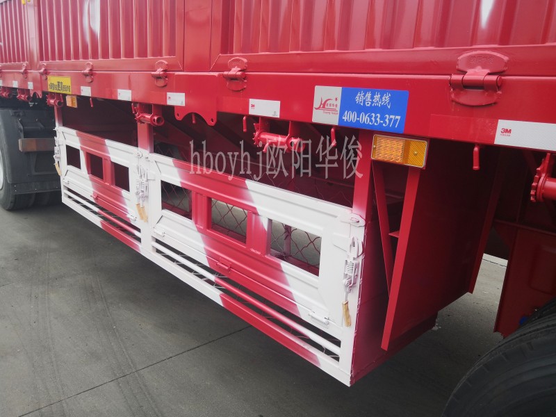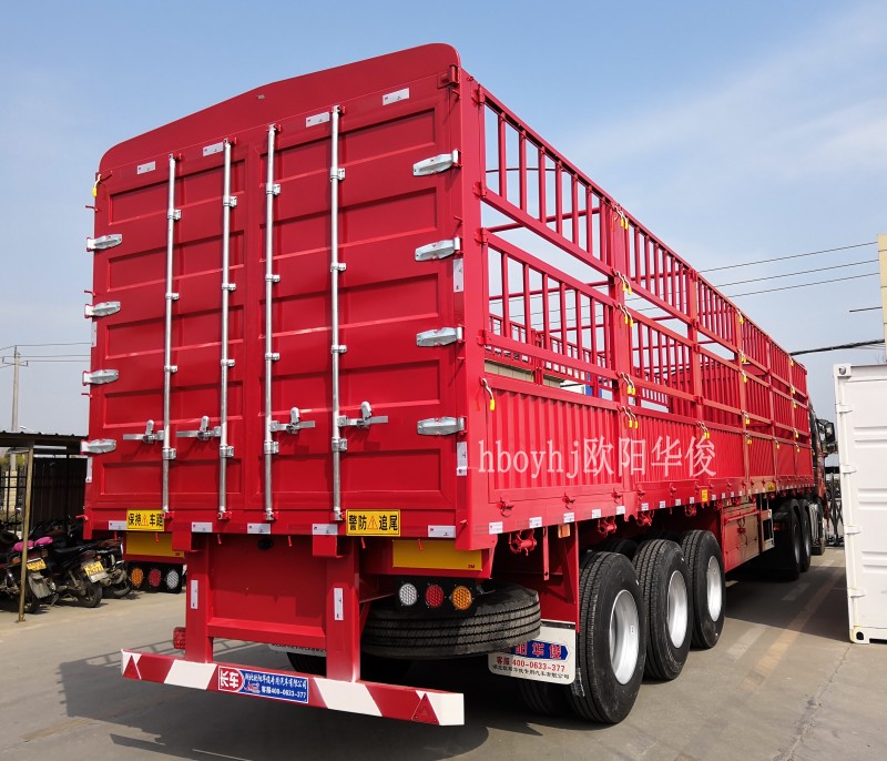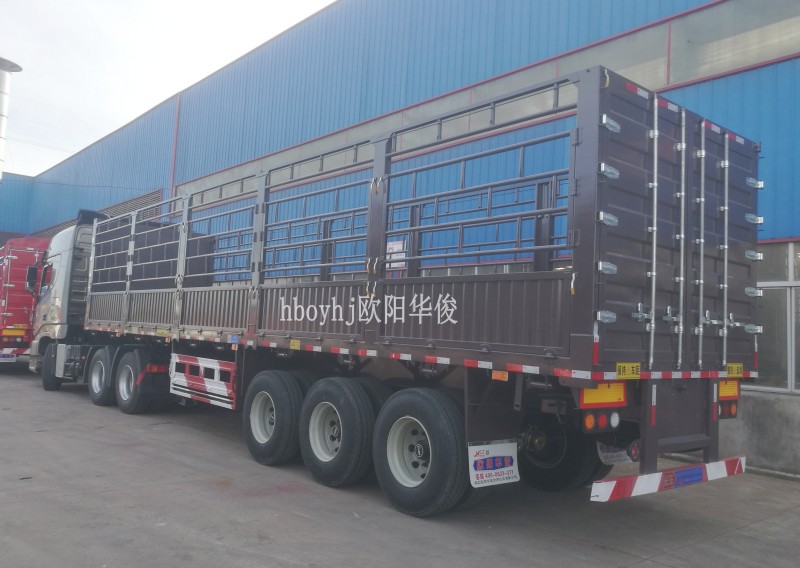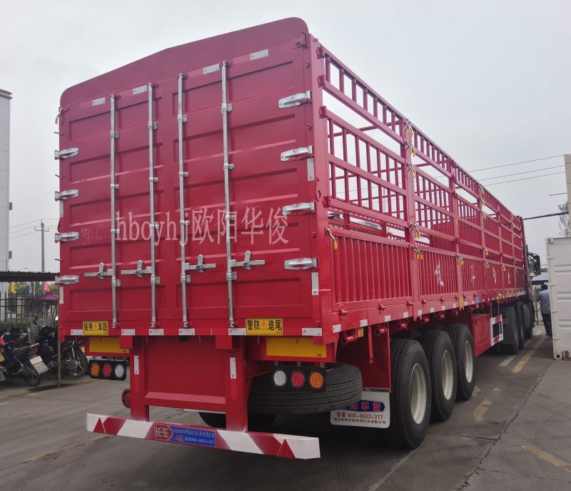 【結構設計】:倉柵式半掛車又稱倉欄半掛車,主要分為鵝頸式和直梁式兩種類型;整車選裝倉柵樣式為一層倉柵、二層倉柵、三層倉柵,倉柵高度可定做成1.6米-2.2米高;后尾可設計成對開門、墻板加花欄、墻板加對開門等樣式;車架采用縱梁和整體貫穿式橫梁組焊而成的空間框架結構;縱梁采用自動埋弧焊焊接,車架采用拋丸處理,車架的強度、剛度、韌性,承載能力強,不發生永久變形。