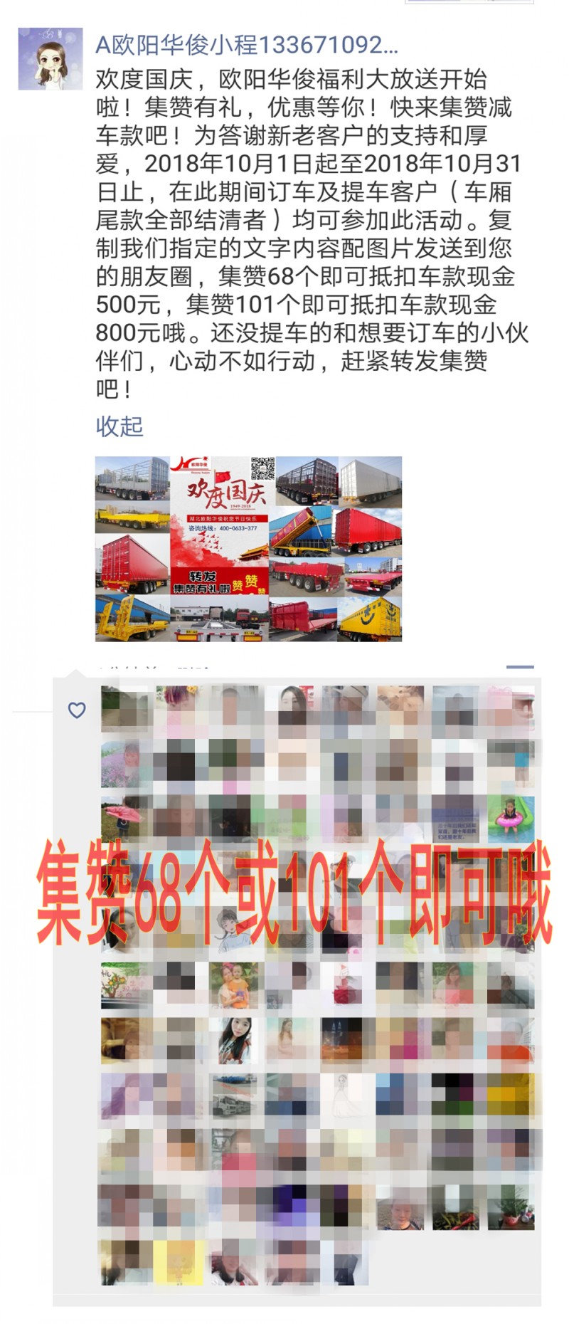 歡度國慶,歐陽華俊福利大放送開始啦!集贊有禮,優惠等你!快來集贊減車款吧!為答謝新老客戶的支持和厚愛,2018年10月1日起至2018年10月31日止,在此期間訂車及提車客戶(車廂尾款全部結清者)均可參加此活動。復制我們指定的文字內容配圖片發送到您的朋友圈,集贊68個可抵扣車款現金500元,集贊101個可抵扣車款現金800元哦。還沒提車和想要訂車的小伙伴們,心動不如行動,趕緊轉發集贊吧!
