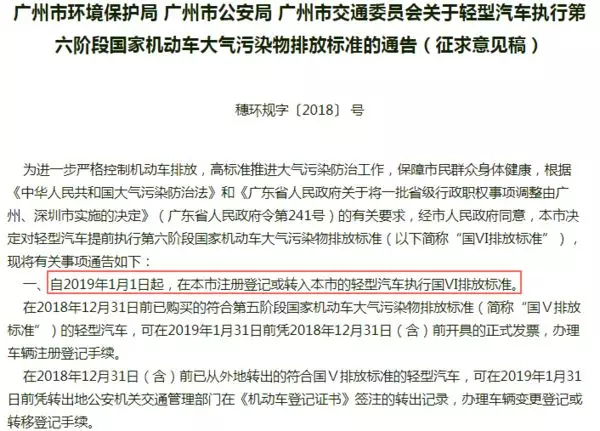 不僅僅是深圳,日前,廣州市環境保護局、廣州市公安局、廣州市交通委員會也就《關于輕型汽車執行第六階段國家機動車大氣污染物排放標準》的通告發布了意見征求稿,通告表示:自2019年1月1日起,在廣州市注冊登記或轉入本市的輕型汽車執行國Ⅵ排放標準。