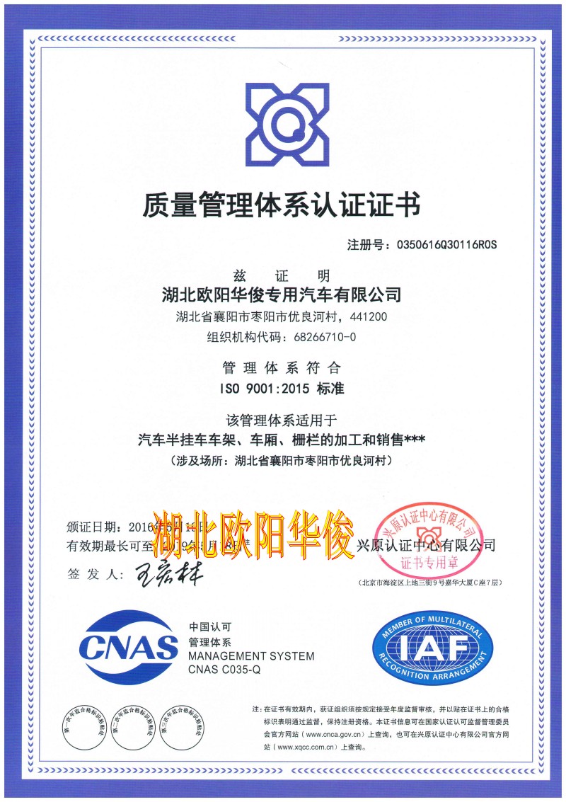 看到這里相信大家對于掛車是怎么生產制造的已經有了大概的了解了,大家在購買掛車時去廠家考察也可以對比看出廠家的技術實力,工廠規模,選擇有資質的廠家可以從根本上保證掛車的產品質量。歐陽華俊是國家工信部公告的半掛車企業,且可出本廠的車型合格證,并通過了ISO9001:2015質量管理系統認證。