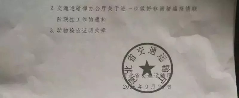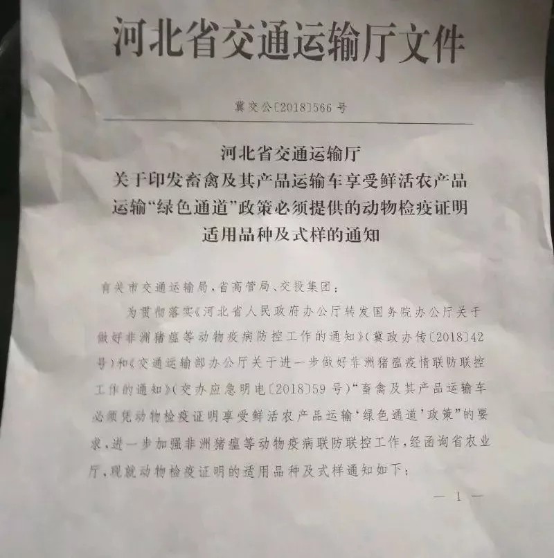 以下為卡友拍攝的《河北省交通運(yùn)輸廳關(guān)于印發(fā)畜禽及其產(chǎn)品運(yùn)輸車(chē)享受鮮活農(nóng)產(chǎn)品運(yùn)輸“綠色通道”政策必須提供的動(dòng)物檢疫證明適用品種及式樣》文件內(nèi)容:
