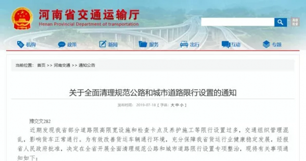 近日,河南省交通運輸廳發布了《關于全面清理規范公路和城市道路限行設置的通知》,要求全省范圍內清理不合規的限高限寬設施,并在9月1日前全部清理完畢。