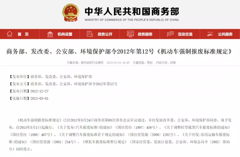 其實早在2012年商務部、發改委、公安部、生態環境部(原環境保護部)四部聯發的《機動車強制報廢標準規定》(2012年第12號)中明確表示: