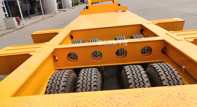 一根輪軸裝4只輪胎,一道軸線就有8只輪胎。所以全車的寬度可達 3米以上。為了降低整車重心,一般裝用直徑小而載重能力大的鋼絲子午線寬輪胎鋼圈,每只輪胎在低速運行條件下可承受4噸左右的載荷。車架采用高強度合金鋼箱形截面的焊接結構。通常一輛5軸線、兩軸列的單體平板掛車可以載重百噸以上,這種配置國外客戶比較受歡迎。