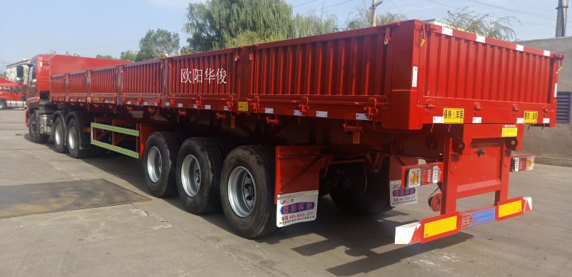 側翻自卸半掛車:可有效地提高裝卸機運輸散裝零散貨物的運輸效率,自卸式半掛車適用于煤炭、礦石、泥沙、建筑物料等散裝零散貨物的運輸。