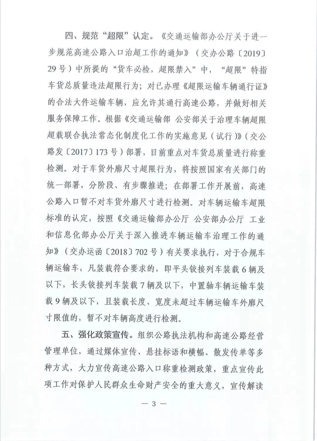 對于車貨外廓尺寸超限行為,將按照國家有關部門的統一部署,分階段、有步驟推進;在部署工作開展前,高速公路入口暫不對車貨外廓尺寸進行檢測。