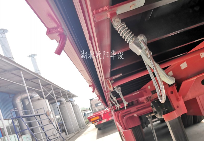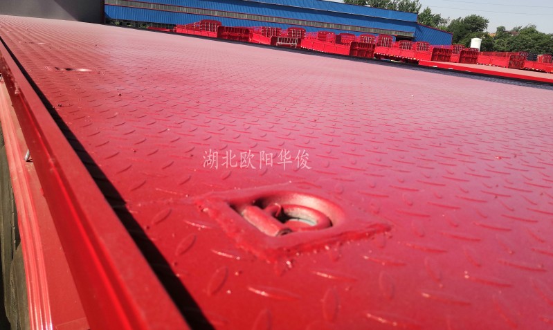 小細(xì)節(jié)放大:每邊裝有彈簧扣13個(gè),固定兩邊的飛翼側(cè)板;底板采用3個(gè)厚的花紋板,上面每邊焊有13個(gè)臥環(huán),固定里面貨的物。