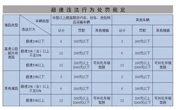中型以上載客載貨汽車、校車、危化品運輸車,在超過高速公路明確限速20%以下的情況下,予以駕駛證記6分、罰款200元以下的處罰。