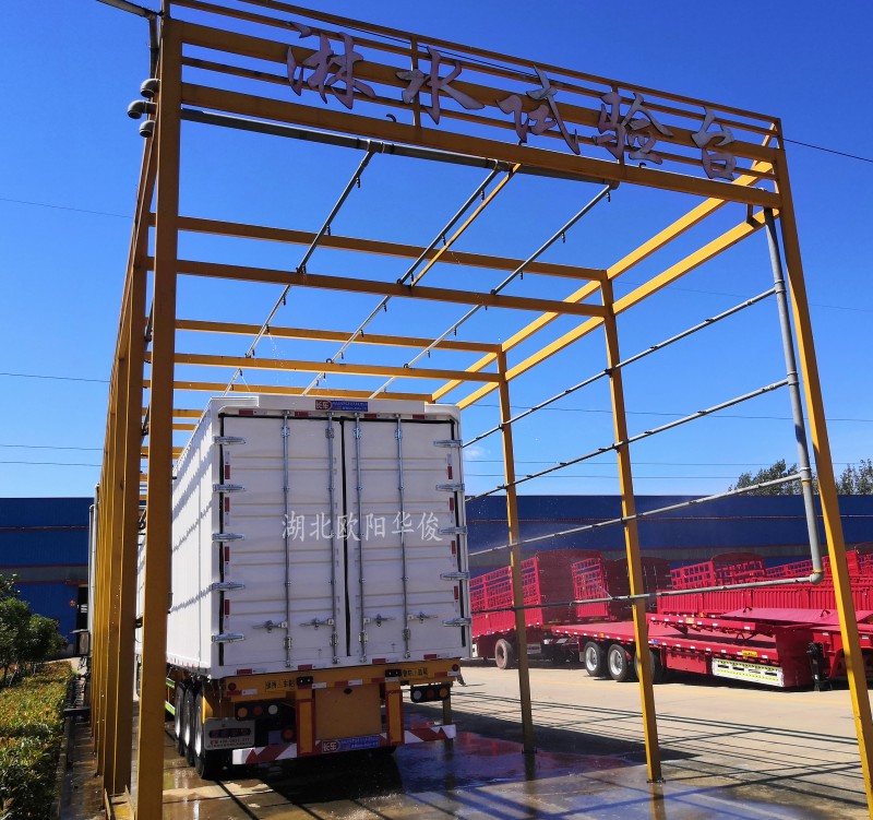 湖北歐陽華俊所生產的廂式集裝箱半掛車、飛翼半掛車,因設計獨特,結構合理,外形美觀,各類性能指標均達到同類產品先進水平,并有防雨、防塵、防曬、防盜、耐腐蝕等優點。廠區內設有淋雨試驗臺,確保每位提車出廠客戶滿意而歸!《公司設計的淋水試驗臺,已獲得國家知識產權局專利證書》