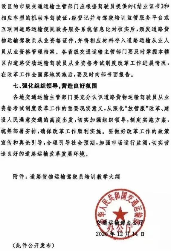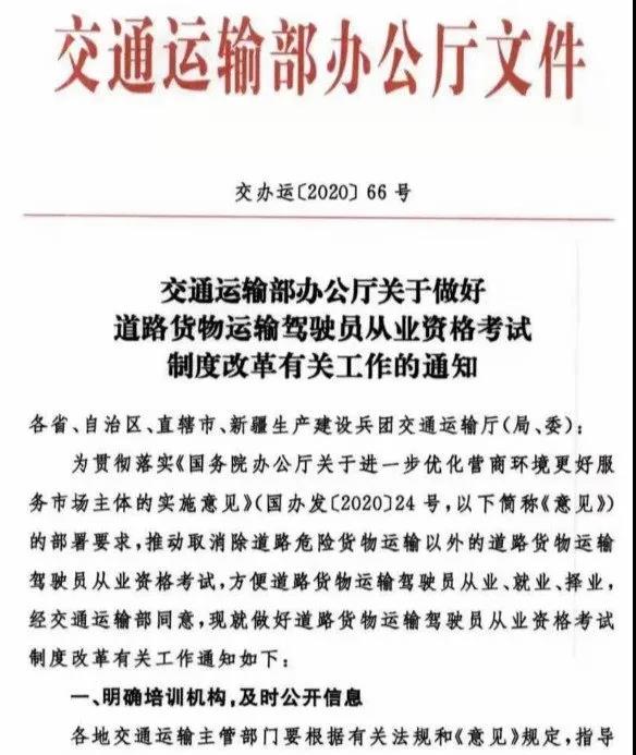 發布日期:2020-12-26 09:40:50 編輯:歐陽華俊 瀏覽量:197636近日,交通運輸部辦公廳發布關于做好道路貨物運輸駕駛員從業資格考試制度改革有關工作的通知,明確表示:自2021年3月1日起,不得再組織開展除道路危險貨物運輸以外的道路貨物運輸駕駛員從業資格證考試。