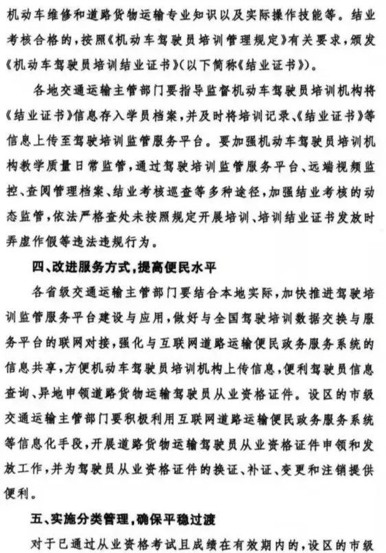 3.改革后申領相應車型機動車駕駛證的,駕駛員要參與培訓并進行結業考核。駕駛員憑《結業證書》和機動車駕駛證申領道路貨物運輸駕駛員從業資格證。