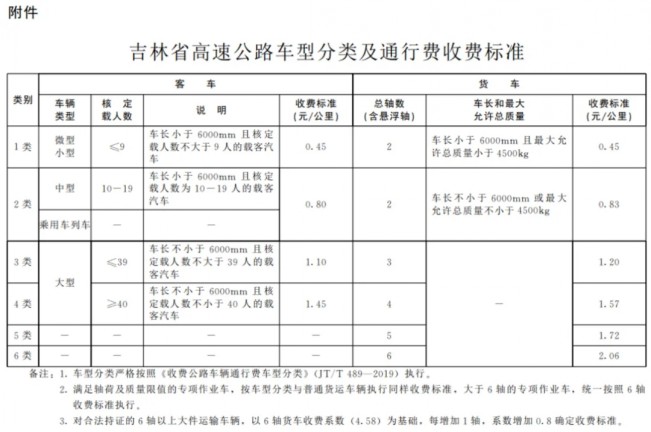 吉林省將在2021年1月10日起,將按照4類車1.57元/公里,5類車1.72元/公里的收費標準對4類車和5類車進行收費。2類車和6類車的優惠政策,也將在2021年2月15日到期后繼續執行,并將打折后的價格固定為今后的正式收費標準。