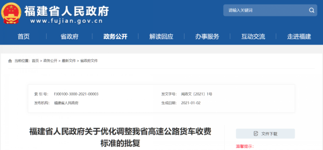 近日,福建省人民政府官網發布了關于調整高速公路貨車收費標準的公告,2-6類貨車的收費系數均有下降,新的收費標準將在今年1月10后開始執行。