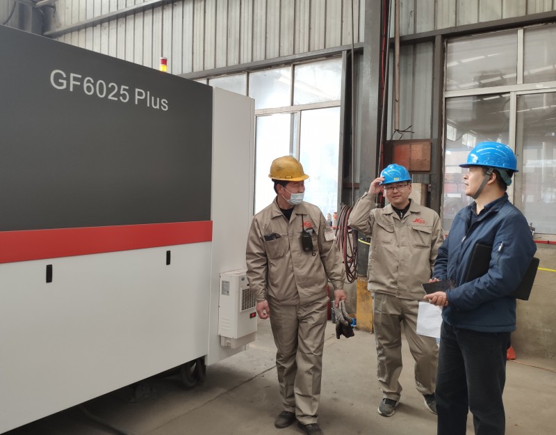 嚴教授與生產部袁部長對歐陽華俊近年來新購入的大型激光切割機使用進行技術交流與指導。
