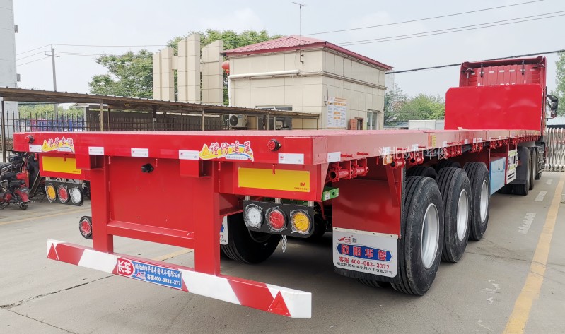 平板半掛車的尺寸:13米長*2.55米寬*2.9米(前站板離地高),此款按客戶要求設計為拉玻璃專用的直梁平板半掛車。