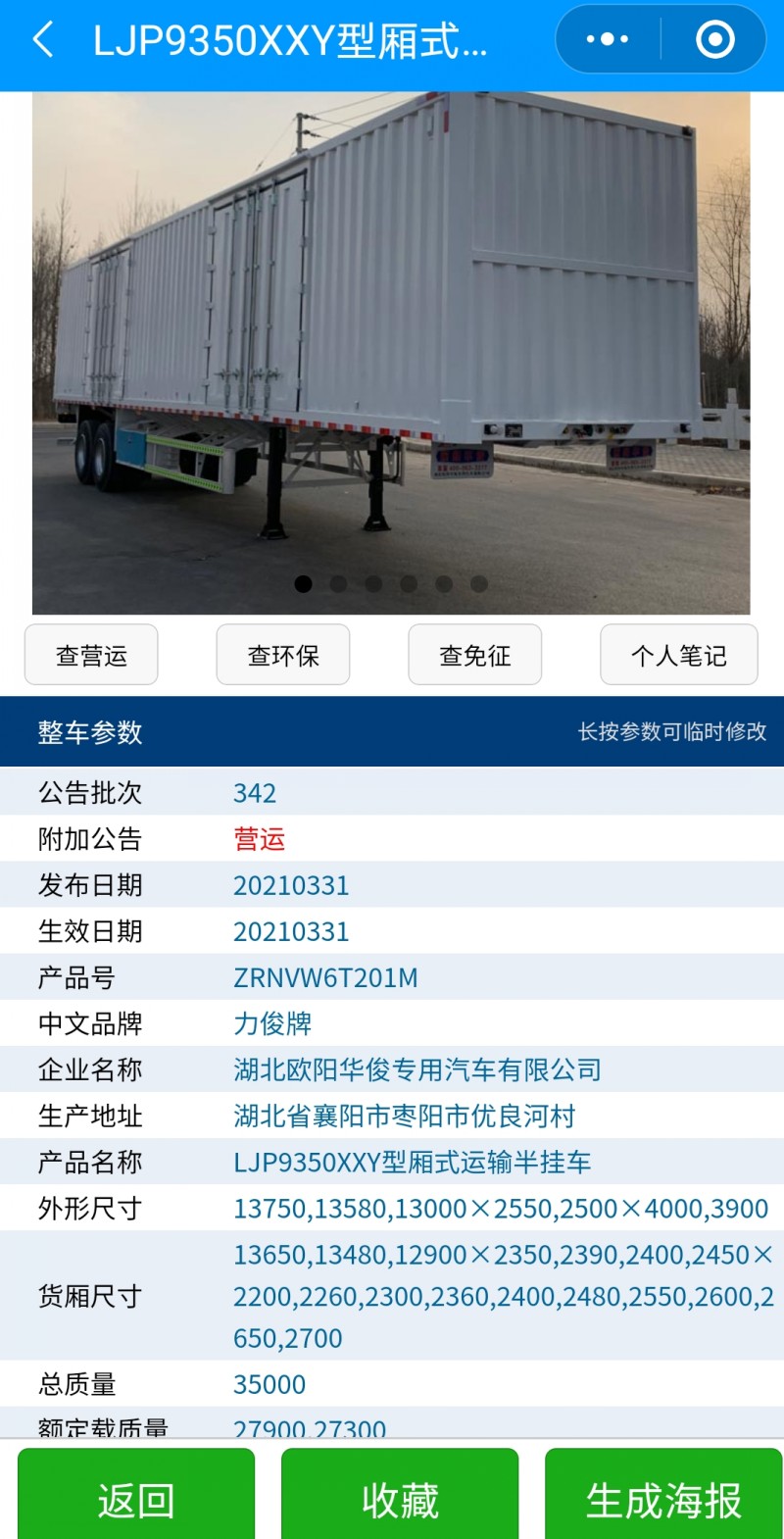 發布日期:2021-05-15 11:46:50 編輯:歐陽華俊 瀏覽量:1797好消息:湖北歐陽華俊專用汽車有限公司的廂式半掛車營運檢測于2021年3月已公示出來,需要13米,13.58米,13.75米長的兩軸廂式半掛車的卡友們有福啦!此款為鋼板橋配置,直梁式或鵝頸式任A選全國各地可上新戶。全新工藝升級,現集裝箱類的半掛車底板采用高質量的竹木底板,在滿足可上叉車的同時減輕整車的重量!