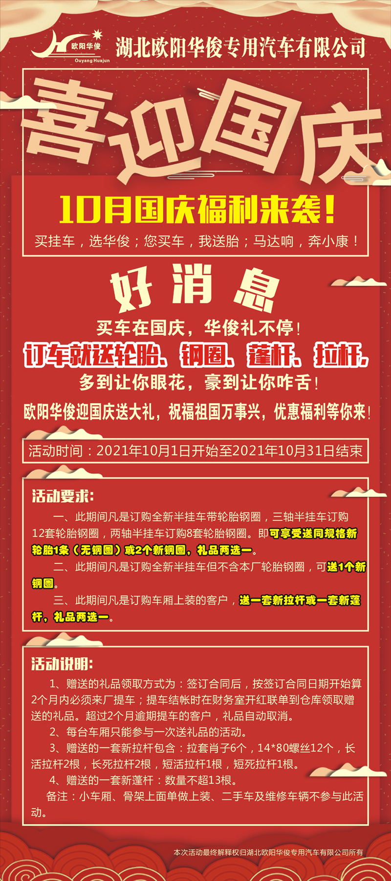 九月初九重陽節(jié),遵守傳統(tǒng)好風(fēng)俗。登高遠(yuǎn)眺金秋景,寓意吉祥步步高。飲酒祈福賞菊花,保佑壽比南山松。尊俗重道度重陽,祝你幸福久久長。 湖北歐陽華俊專用汽車有限公司買掛車送輪胎,10月特惠福利,歡迎下單!