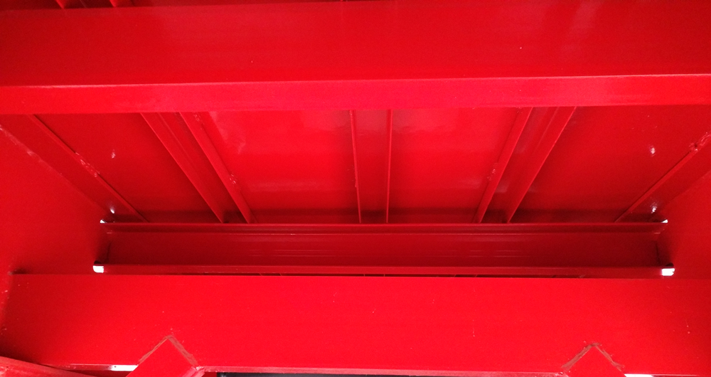 【結構設計】:客戶主要跑飲料、水果等輕泡貨,需要上叉車,因此采用的是標準配置,2.2米高,鋪9根底槽,3.0花紋板,足夠結實!車架采用縱梁和整體貫穿式橫梁組焊而成的空間框架結構。能均衡車架的強度、剛度、韌性,承載能力強,不發生永久變形。