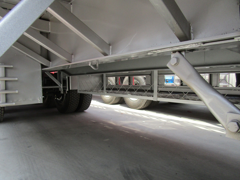 【結構設計】:車架采用縱梁和整體貫穿式橫梁組焊而成的空間框架結構。能均衡車架的強度、剛度、韌性,承載能力強,不發生永久變形。腹板高度從400至500,縱梁采用自動埋弧焊焊接,車架采用拋丸處理,橫梁穿入縱梁并焊接整體。