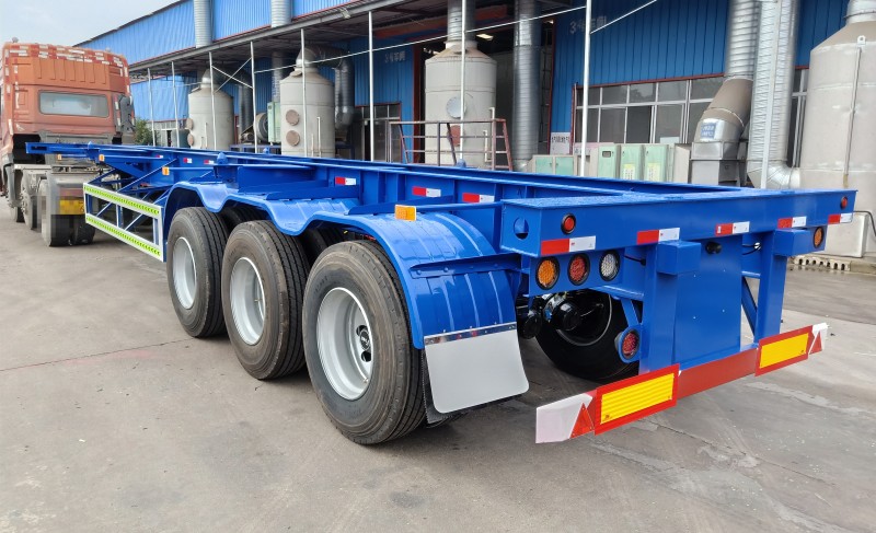 歐陽華俊40英尺藍色三軸骨架半掛完工批量交付湖北客戶啦!此骨架半掛車的尺寸為:12.5米長×2.55米寬×1.5米(離地高),本公司生產的骨架式半掛車采用很佳的設計方案,結構合理,操作可靠,外觀優美,上面可配集裝箱,罐子類使用,發揮整車的很大潛能。