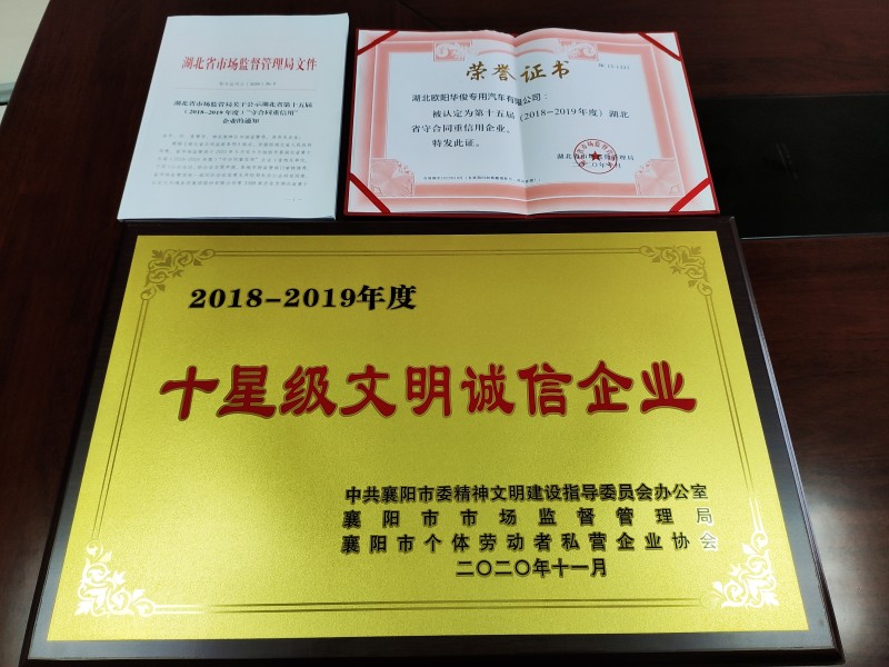 湖北省市場監督管理局對“守合同重信用”企業開展了綜合評定機制,從品牌的社會影響力、合同信用管理體系、合同行為、合同履約狀況、經濟效益、社會信譽等多方面進行評選,湖北歐陽華俊專用汽車有限公司被認定為第十五屆(2018-2019年度)湖北省守合同重信用企業,并為企業頒發榮譽證書。