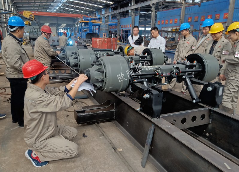 根據《GB7258-2017》的要求,從2020年1月1日起,三軸欄板式、倉柵式半掛車應裝備盤式制動器。同時,總質量大于12000kg的三軸欄板式、倉柵式半掛車都應裝備空氣懸掛。歐陽華俊為了生產工藝很優化進行改進提升,特邀請多家知名品牌車橋專業技術人員到廠區進行技術交流與指導。